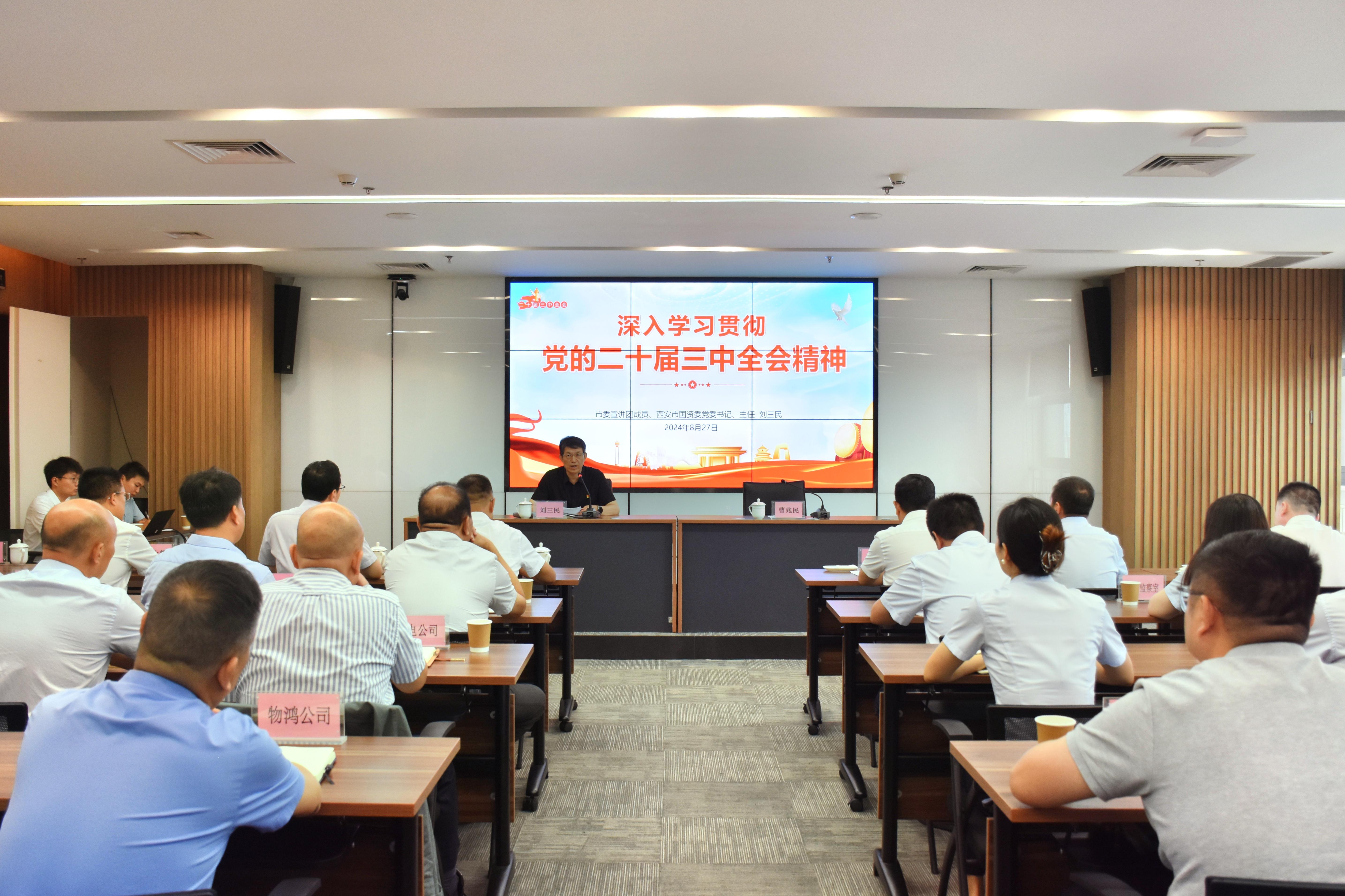 8月27日,西安商貿(mào)物流集團(tuán)舉辦學(xué)習(xí)貫徹黨的二十屆三中全會(huì)精神宣講報(bào)告會(huì),邀請(qǐng)市委宣講團(tuán)成員、市國(guó)資委黨委書(shū)記、主任劉三民作宣講報(bào)告。集團(tuán)黨委書(shū)記、董事長(zhǎng)曹兆民主持會(huì)議。