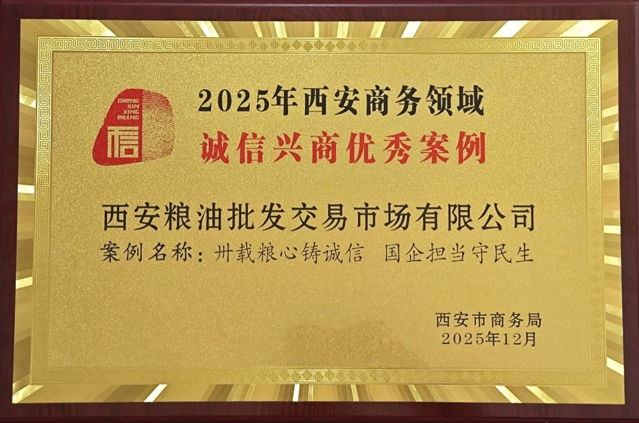 西安糧油批發(fā)交易市場(chǎng)有限公司榮獲2025年西安商務(wù)領(lǐng)域“誠(chéng)信興商優(yōu)秀案例”
